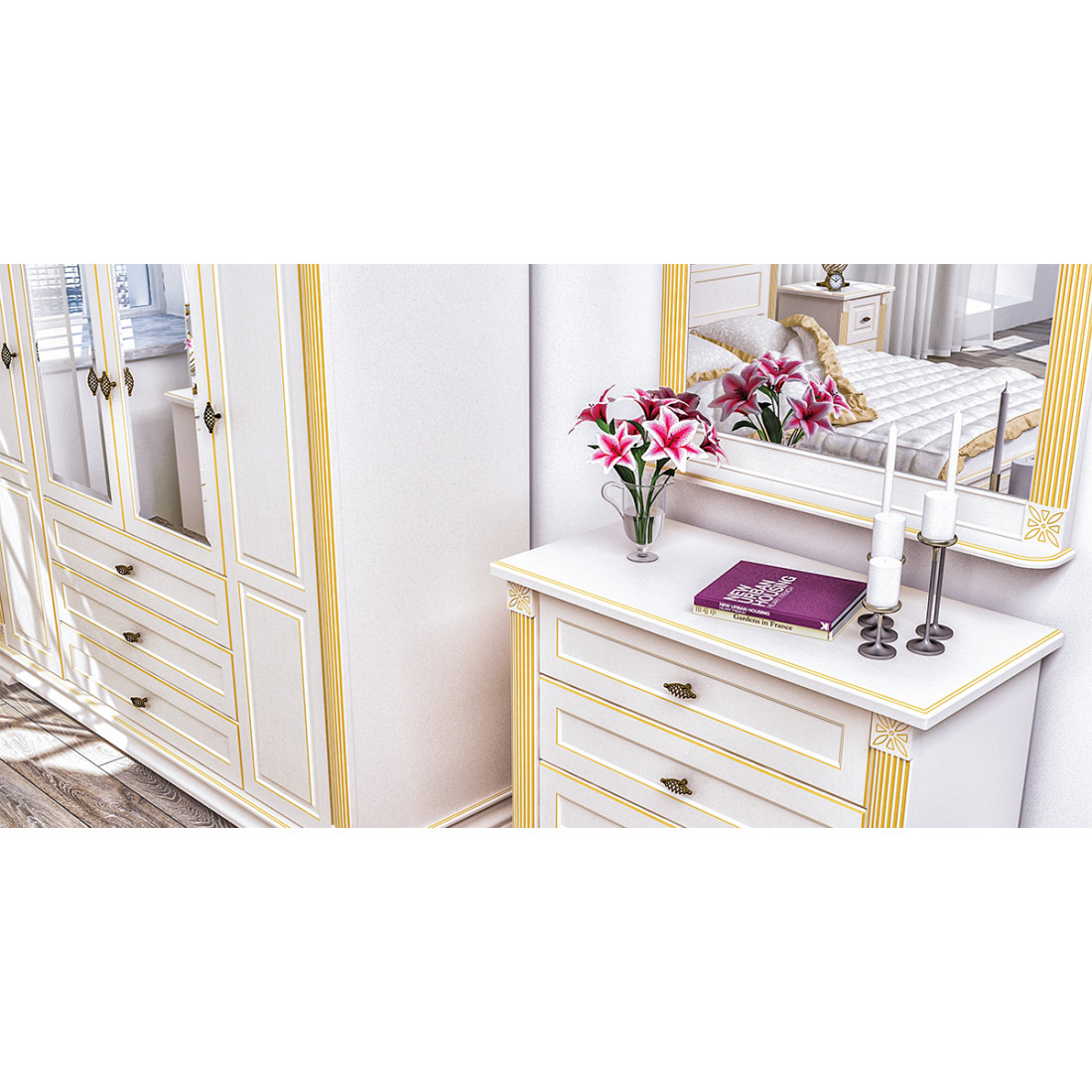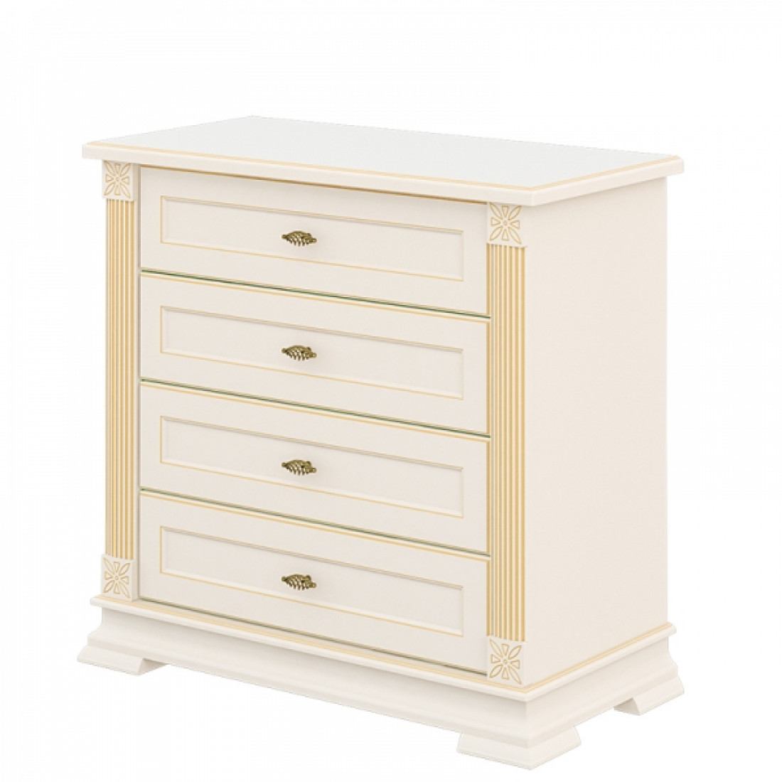 Бельевой комод для спальни МН-222-11 новой серии Афина от Мебель-Неман выполнен в цвете "крем с золотой патиной".