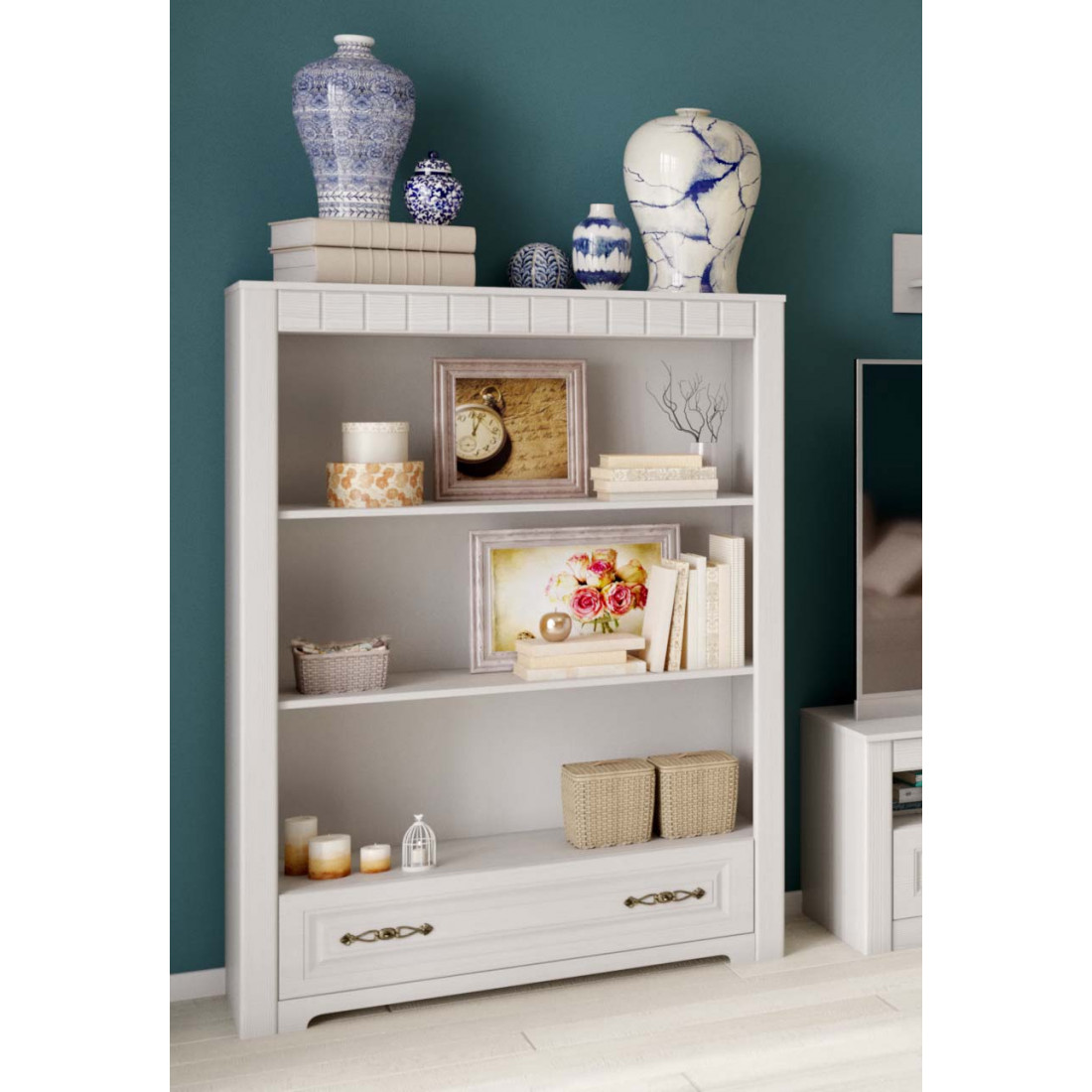 Гостиная Прованс композиция 1 от Мебельград - легкие ноты очарования сельской местности, простота линий и домашний уют - вот основные мотивы мебели этого стиля. ​На полках Вы сможете разместить свои любимые предметы интерьера, книги, вазы, памятные сувениры, которыми завершите образ гостиной.